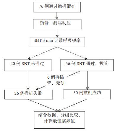 1.4 撤机结果评价对耐受1 h SBT的患者, 由临床医师判断予以拔除气管导管, 继续观察48 h。以下几种情况认为撤机失败[11-12]:SBT失败; 或者SBT成功拔管后48 h内再次进行有创或无创机械通气; 或者SBT后48 h内死亡。