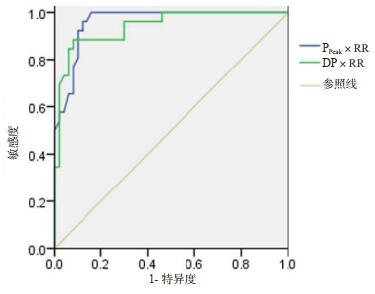 | 图 2 Ppeak× RR、DP× RR的ROC曲线 Fig 2 Receiver operating characteristic curve for Ppeak× RR and DP× RR |