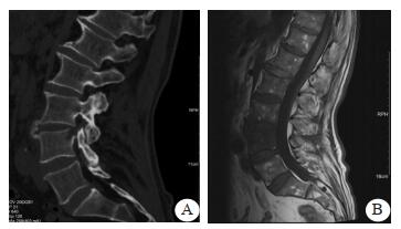 | 图 1 患者骨科门诊就诊影像学结果(A: CT示腰4椎体上缘局部骨质吸收、破坏, 椎旁软组织稍肿胀; B:MRI示腰4椎体上缘局部骨质破坏, 腰3/4椎体斑片状骨髓水肿, 椎旁软组织水肿) |