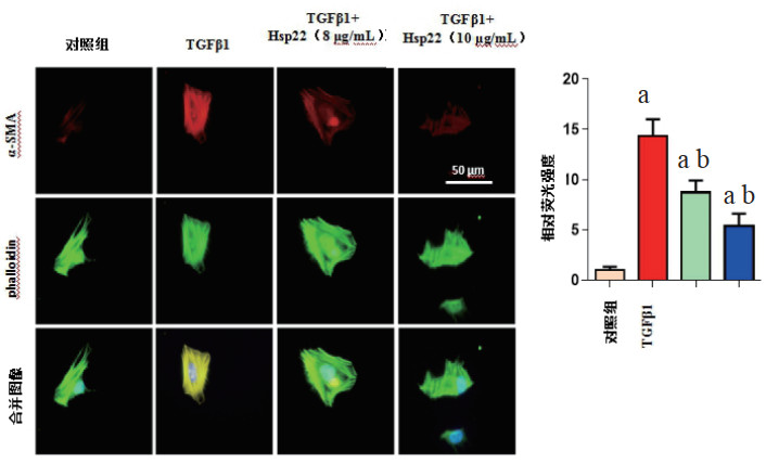 | 图注:镜下可见α-SMA(红色)的表达,放大倍数400倍,绿色表示phalloidin(鬼笔环肽),蓝色表示细胞核。与对照组比较, aP<0.05);与TGFβ1组比较, bP<0.05 图 2 Hsp22对α-SMA表达的影响 Fig 2 Effect of Hsp22 on α-SMA expression |