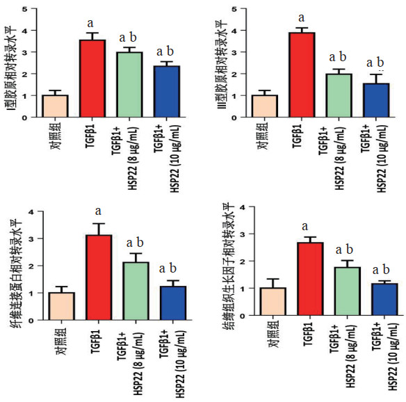 | 图注:与对照组比较aP<0.05;与TGFβ1组比较bP<0.05 图 3 Hsp22对促纤维化因子转录水平的影响 Fig 3 Effect of Hsp22 on transcription level of fibrotic factor |