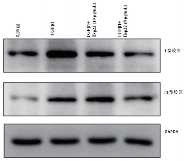 RT-PCR结果显示:TGFβ1刺激成纤维细胞48 h,成纤维细胞I型胶原、Ⅲ型胶原、纤维连接蛋白和结缔组织生长因子表达的转录水平明显高于对照组(P<0.05);而TGFβ1+8 μg/mL Hsp22和TGFβ1+10 μg/mL Hsp22两组细胞中上述促纤维化因子的转录水平均低于TGFβ1组(P<0.05),但是仍高于对照组(P<0.05)(图 3)。免疫印迹结果显示:成纤维细胞I型胶原、Ⅲ型胶原蛋白表达量在TGFβ1刺激后升高,而TGFβ1+8 μg/mL Hsp22减少I型胶原表达,并未减少Ⅲ型胶原蛋白表达;TGFβ1+10 μg/mL Hsp22减少I型胶原、Ⅲ型胶原蛋白表达(P<0.05)(图 4,表 1)。