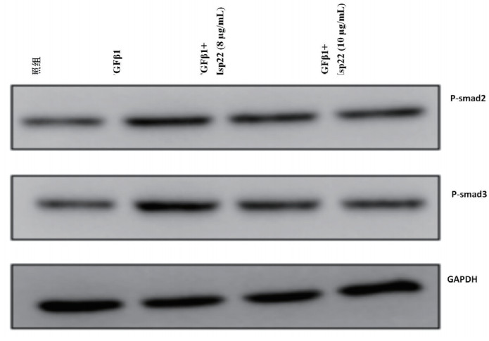检测经典的TGFβ-smad信号通路,免疫印迹发现smad2和smad3的磷酸化水平在TGFβ1组明显升高,而TGFβ1+8 μg/mL Hsp22组smad2和smad3的磷酸化水平与TGFβ1组差异无统计学意义(P>0.05);TGFβ1+10 μg/mL Hsp22组smad2和smad3的磷酸化水平低于TGFβ1组(P<0.05)(图 6,表 3)。