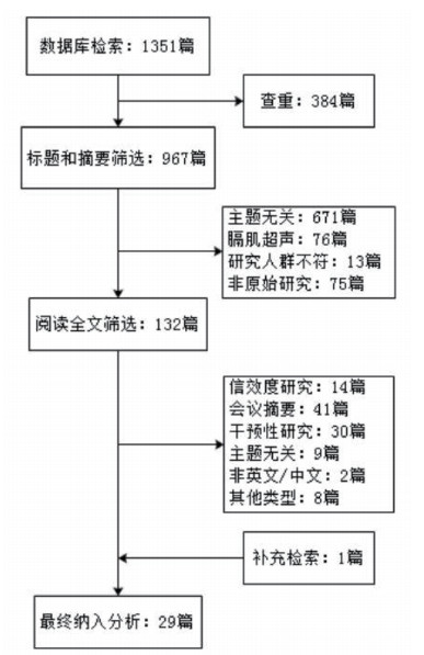 1.1.2 排除标准① 单纯膈肌超声相关研究;②结局指标为信效度;③无法获取全文的文献、会议摘要、病例报告、干预性研究等。