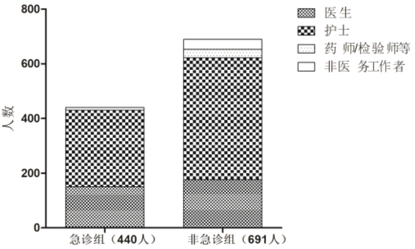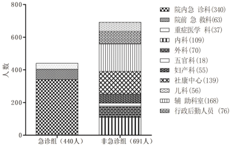 急诊组与非急诊组再进行亚组分析如图 2所示,急诊组440人(38.90%)中,来自院前急救科63人(14.51%)、急诊科340人(占77.09%)、重症医学科37人(8.40%);非急诊组691人(61.10%)中按人数排序,分别为辅助科室168人(24.29%)、社康中心139人(20.11%)、行政后勤组76人(11.00%)、内科109人(15.77%)、外科70人(10.14%)、儿科56人(8.11%)、妇产科55人(7.96%)和五官科18人(2.62%)。