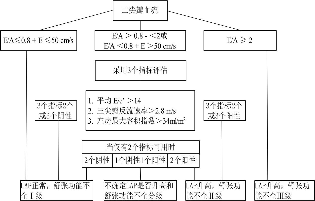 2016年版诊断标准[12]:⑴二尖瓣瓣环e'速度(室间隔e'< 7 cm/s,侧壁e'< 10 cm/s);⑵E/e'比值(平均 > 14,室间隔 > 15,侧壁 > 13);⑶左房最大容积指数 > 34 mL/m2;⑷TR峰值流速 > 2.8 m/s。对于二维超声射血分数正常及无心肌疾病证据的患者,两个以上指标均未达到临界值,提示左室舒张功能正常;如果两个以上指标均超过临界值,提示左室舒张功能异常;如果恰好两个指标未达到临界值,则为舒张功能不确定。