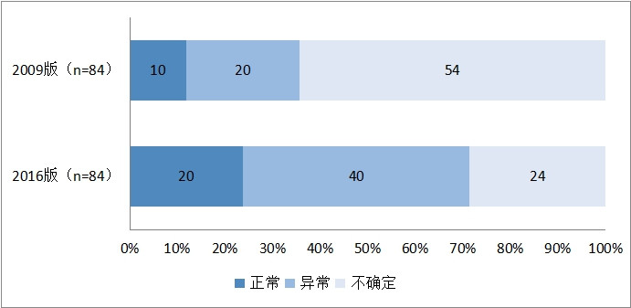 根据2016年版指南,入ICU 24 h内,110例患者中37例(34%)舒张功能正常,43例(39%)有舒张功能不全,另有30例(27%)为舒张功能不全不确定。根据2009年指南,有12例(11%)为舒张功能正常,40例(36%)舒张功能不全,而有58例(53%)为舒张功能不全不确定。两版指南对不同等级左室舒张功能不全的诊断构成比差异较大(Z=4.92,P < 0.01)。见图 3。