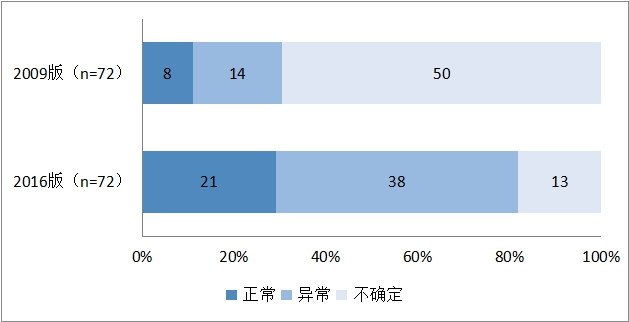入ICU第3天,72例患者收缩功能正常,根据2016年指南,21例(29%)舒张功能正常,38例(53%)舒张功能不全,13例(18%)舒张功能不确定。根据2009年指南,8例(11%)舒张功能正常,14例(19%)舒张功能不全,50例(70%)为舒张功能不确定。同样,两版指南诊断差异较大(Z=5.71,P < 0.01)。