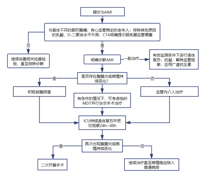 AMI高度怀疑的指征在于突发与查体不符的剧烈腹痛,酸中毒或D-二聚体升高,以及心律不齐的病史等。应用影像学技术(CTA)可帮助建立诊断。在明确AMI之后,应立即进行液体复苏、抗凝、解除肠系膜血管痉挛等治疗。同时准备多学科会诊,评估肠道活力并决定手术方式。随后,使用损伤控制技术和持续的重症监护至关重要。根据对肠道的二次评估,可按需要进一步切除肠道或吻合切口。在此过程中,急诊医师,放射医师,介入医师,麻醉科医师和外科医师之间的紧密合作至关重要。