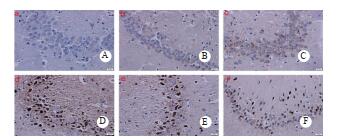 | A:正常组,B:DEACMP组造模1d, C:DEACMP组造模7d, D:DEACMP组造模14d, E:DEACMP组造模21d, F:DEACMP组造模28 d. 图 2 海马CA3区iNOS的表达(免疫组织化学x400) Fig 2 Expression of iNOS in the CA3 area of the hippocampus(immunohistochemistry x 400) |
