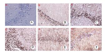 | A:正常组,B:DEACMP组造模1 d, C:DEACMP组造模7d, D:DEACMP组造模14d, E:DEACMP组造模21d, F:DEACMP组造模28d. 图 3 海马CA3区nNOS的表达(免疫组织化学x400) Fig 3 Expression of nNOS in the CA3 area of the hippocampus(immunohistochemistry x 400) |