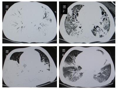 | 图 1 图 1、2分别示例7急性期,两肺几乎完全实变;恢复期,肺纤维化及坏死空洞图。图 3、4分别示例4急性期,背段大面积融合实变伴肺气肿;恢复期,树芽状增生,毛玻璃样变。 |