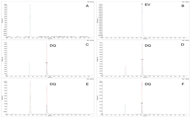 2 结果 2.1 方法学验证 2.1.1 方法专属性在液相色谱-质谱联用条件下,DQ色谱图峰形良好,DQ与EV的保留时间在4.6 min,生物样品中内源性物质与目标性成分无干扰,具有良好的专属性(图 1)。