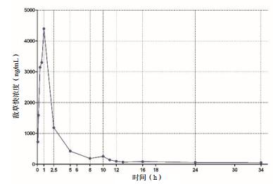 | 图 2 敌草快经灌胃染毒后大鼠平均血药浓度-时间曲线 Fig 2 Mean plasma concentration-time profiles of diquat in rats after intragastric administration |