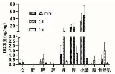 通过测定大鼠染毒25 min、1 h和1 d三个时间点不同组织DQ浓度发现,DQ在大鼠体内分布广泛,几乎分布到各个器官。通过对不同时间点不同组织DQ浓度进行分析发现,在同一时间点不同组织DQ浓度均差异有统计学意义(P < 0.01);除心、肝脏和肺脏外,同一组织在不同时间点DQ浓度也均差异有统计学意义(P < 0.01),见表 3,其中小肠、胃、肾脏组织中DQ浓度较高,骨骼肌、脾脏和脑组织次之,且均在染毒25 min即可检测到,染毒1 h DQ浓度较前增加,染毒1 d DQ浓度较前明显下降,见图 3。
