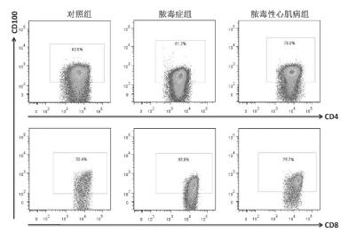 | 图 1 对照组、脓毒症组和脓毒性心肌病组CD4+ T细胞和CD8+ T细胞表面CD100表达的典型流式细胞检测 Fig 1 CD100 expression on CD4+ T cells and CD8+ T cells by flow cytometry in the control, sepsis, and septic cardiomyopathy groups |