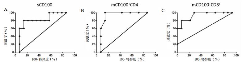 | A:sCD100预测患者预后(AUC=0.814,P=0.042);B:mCD100+CD4+T细胞比例预测患者预后(AUC=0.907,P=0.008);C:mCD100+CD8+T细胞比例预测患者预后(AUC=0.935,P=0.004) 图 2 预测脓毒性心肌病预后的ROC曲线 Fig 2 The ROC curve of prognosis of septic cardiomyopath |