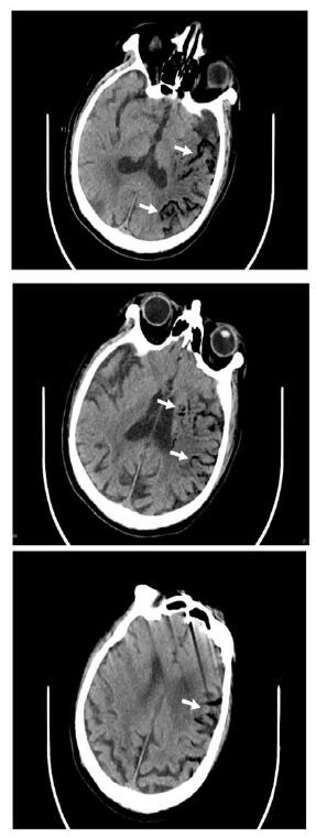 | 左侧大脑不同层面内沿血管走行低密度气体影,考虑气体栓塞(白色箭头示) 图 1 患者颅脑CT结果 |