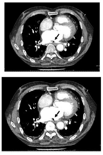 | 不同层面内左心房内低密度影,考虑心房食管瘘后气体残留,周围有血栓形成(黑色箭头示) 图 2 患者胸部增强CT结果 |