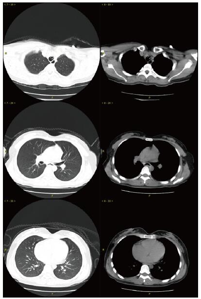 当晚20时到达本院,入院时患者昏迷,血压低、心肌损伤、轻度心衰, 低氧血症, 肝损伤。相关实验室检查:血气PaO2 44 mmHg,生化指标谷丙转氨酶(ALT)528.8 U/L,谷草转氨酶(AST)780.9 U/L,胆红素正常,尿素氮(BUN)3.6 mmol/L,肌酐(Cr)125.7 μmol/L,血糖7.88 mmol/L,心肌肌酐蛋白(cTnT)55.94 ng/mL,N末端B型利钠肽原(NT-pro BNP)495.7 pg/mL,神经元特异性烯醇化酶(NSE)47.46 ng/mL。胸部CT未见明显异常(图 1),头颅CT未见明显异常(图 2A)。给予异甘草酸镁保肝,乙酰半胱氨酸抗氧化,兰索拉唑保护胃黏膜,并予血液灌流治疗一次。