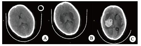 | A:入抢救室当日(中毒首日);B:住院第5天(中毒第6天);C:住院第8天(中毒第9天) 图 2 患者头颅CT影像 |
