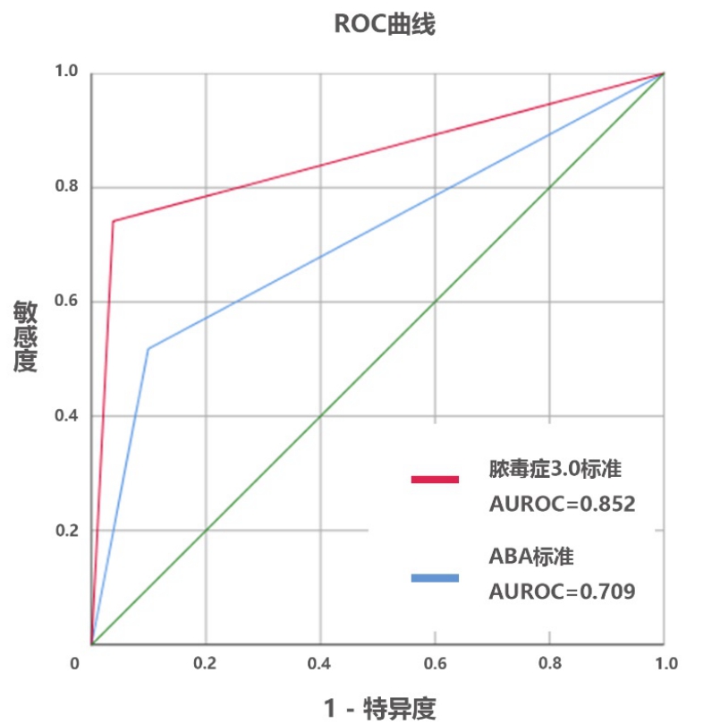 | 图 1 ABA标准和脓毒症3.0标准诊断ROC曲线 |