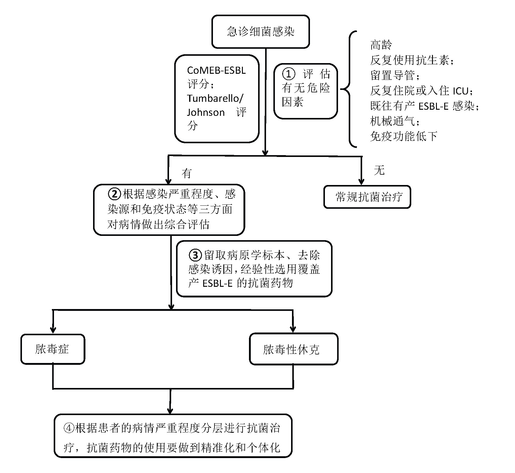 | 图 1 急诊产ESBLs肠杆菌感染的诊疗流程 |