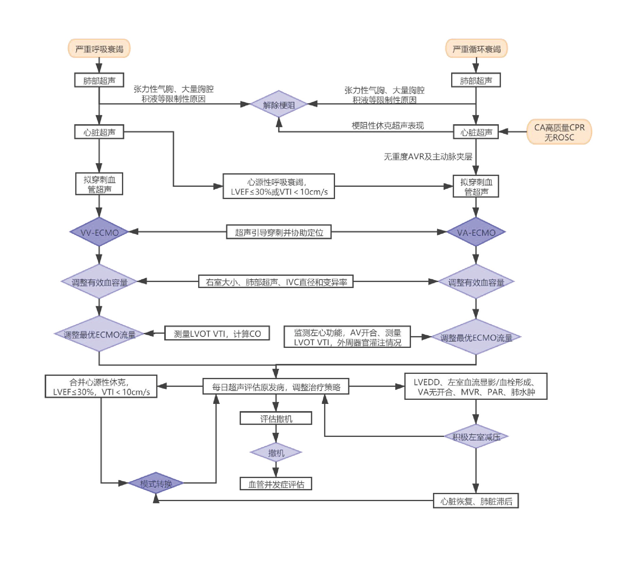 不论是在VV-ECMO或VA-ECMO运行过程中,利用床旁超声对心脏功能评估及每日监测非常重要。