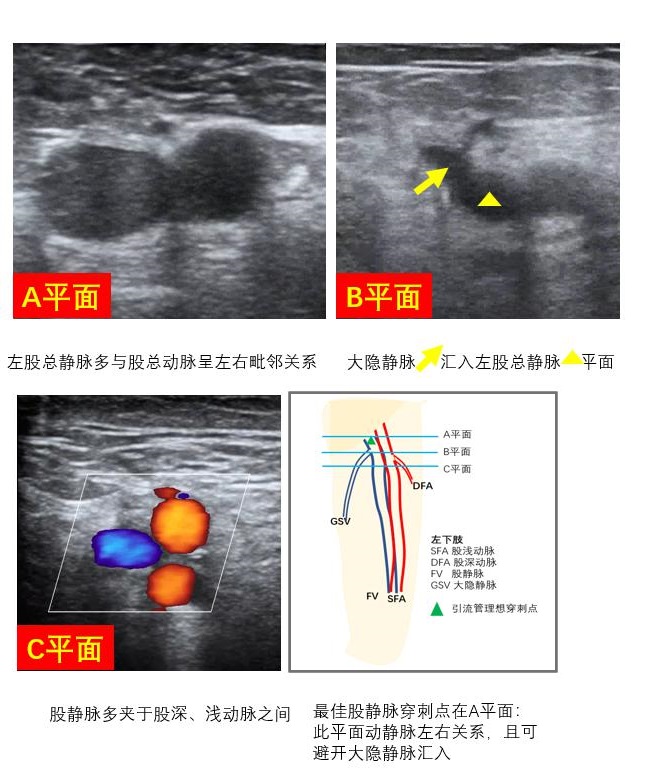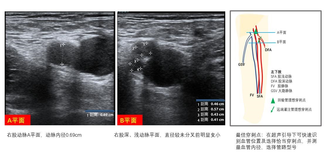 ② VA-ECMO急诊VA-ECMO血管通路的选择通常是股静脉-股动脉途径,其中,静脉超声探查同VV-ECMO。对股动脉和股浅动脉超声探查包含以下内容: