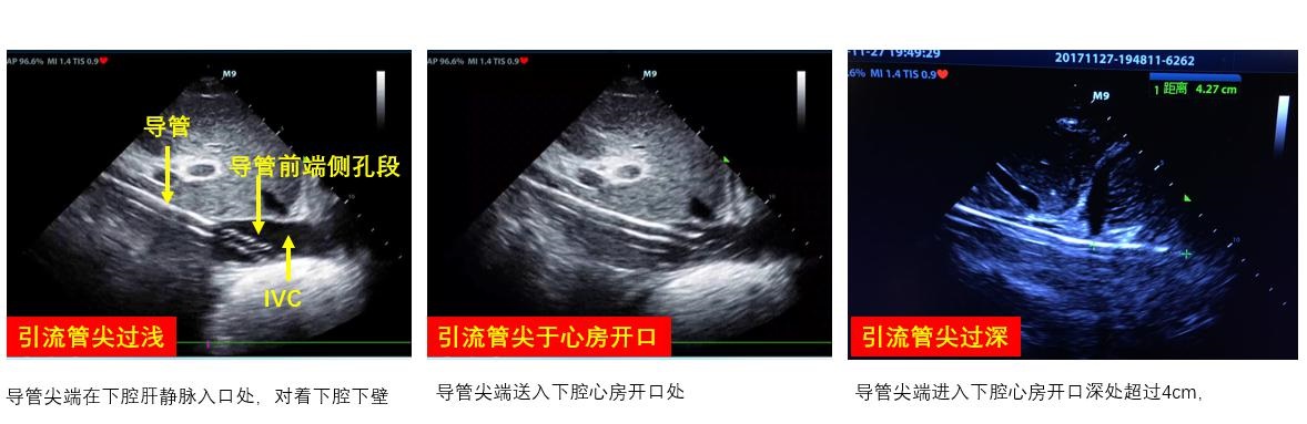 ③ 下腔静脉虽然不是直接穿刺部位,但仍建议在ECMO实施前对下腔静脉进行超声扫查。ECMO静脉引流管末端通常置于下腔静脉汇入右心房处,穿刺前对下腔静脉直径和变异率进行测算,有助于对患者容量状态进行评估和准备(图 13),此外,下腔静脉直径易受体位(如俯卧位)、腹腔内压、自主呼吸等影响,导致引流不畅,影响ECMO实施效果。可测量超声制定的拟穿刺点与右心房入口的距离预估静脉管路置管深度(图 14),避免穿刺时管路置入过深,避免心脏刺激和损伤风险及减少VV-ECMO再循环率;也避免置入深度不够,影响引流(图 15),超声可实时直视下调整引流管位置(图 16)。