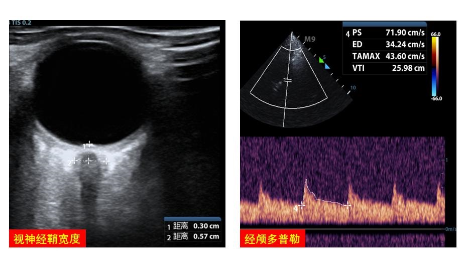 2.5 中枢神经系统大脑中动脉血流多普勒可协助评估脑血流灌注,协助调整VA-ECMO流量。视神经鞘宽度的超声探查可协助评估和管理患者脑水肿情况(图 21)。