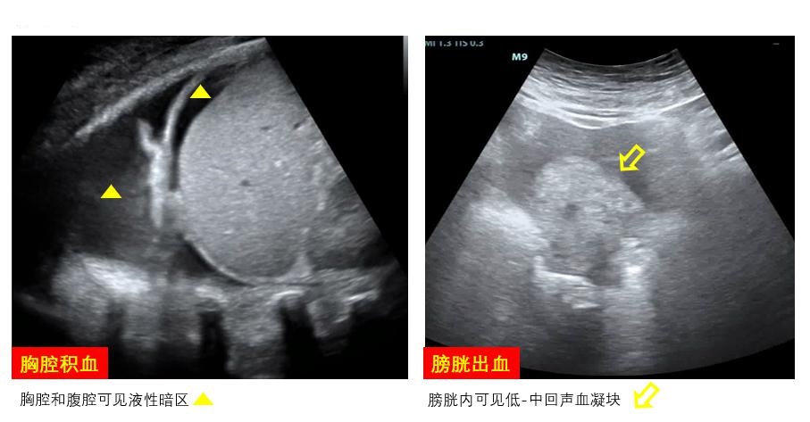 出血是ECMO患者常见的并发症,床旁超声可通过直接或间接超声证据协助判断出血部位、血肿范围、对周围组织器官压迫情况等(图 25)。明确出血部位和出血量可为抗凝强度调整提供参考,此外,超声还可以协助积血定位和穿刺引流。