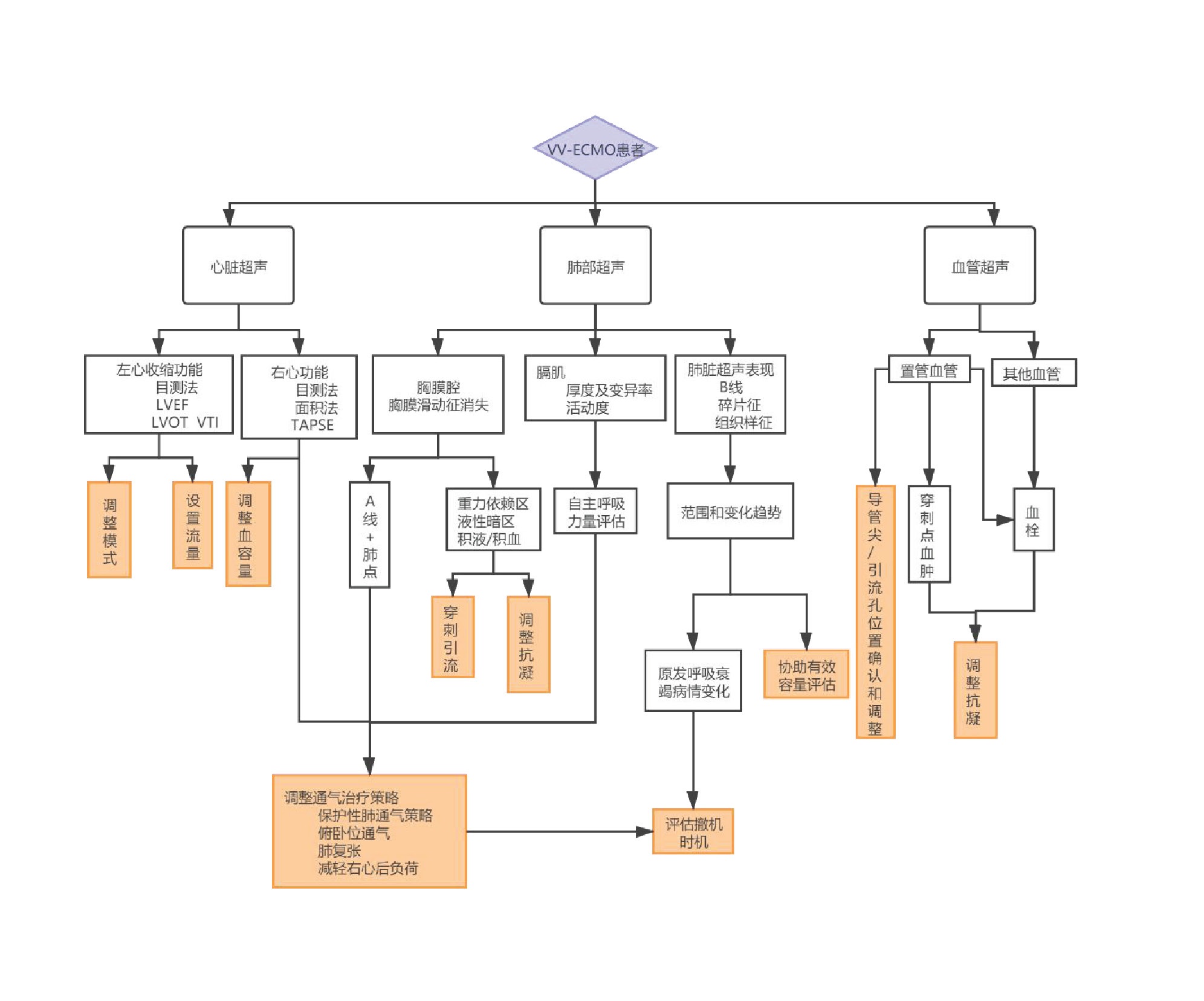 ⑨ 原发病改善后,推荐对患者每日床旁超声评估撤机指征。