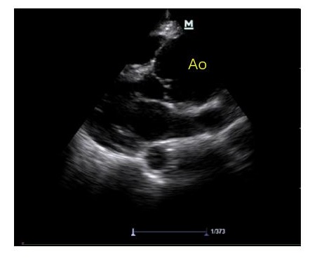 | 可见主动脉(AO)增宽,明显大于左心房 图 3 主动脉夹层超声表现 |