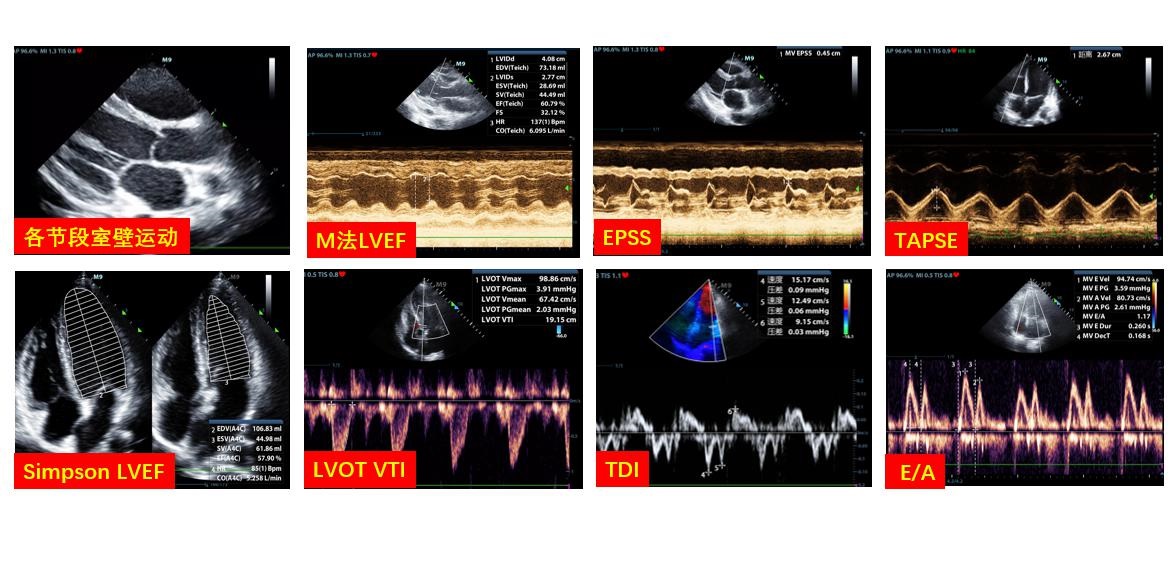 | LVEF:左室射血分数;EPSS:舒张期二尖瓣前叶最大开放点(E点)与室间隔左室面的最小距离;TAPSE:三尖瓣环平面收缩期位移值;LVOT:左室流出道;VTI:速度时间积分;TDI:组织多普勒;E/A:E峰速度与A峰速度比值 图 5 超声评估心脏收缩功能的各类指标 |