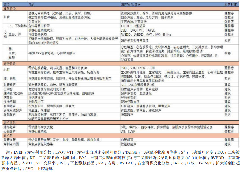 ① 拟行ECMO患者,建议超声评估ECMO治疗的适应证与禁忌证;②推荐床旁超声评估影响ECMO流量状态因素,协助制定ECMO治疗策略;③ECMO实施前推荐床旁超声对穿刺血管进行探查,选择最佳置管路径和方式;④经皮穿刺ECMO置管时,建议超声引导下进行;⑤推荐超声确定导管尖端/引流孔的位置,以便获得最佳引流/回流状态;⑥建议床旁超声对ECPR患者进行病因探查。