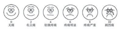 (2)交流困难的人群,如儿童、老年人、意识不清或不能用言语准确表达的患者,可使用Wong-Baker面部表情量表(Wong-Baker face pain rating scale)[22]:由6张从微笑或幸福直至流泪的不同面部表情图组成(图 2)。但这种方法易受情绪、文化、教育程度、环境等因素的影响,应结合具体情况使用。Wong-Baker面部表情量表的临床评定同NRS法。