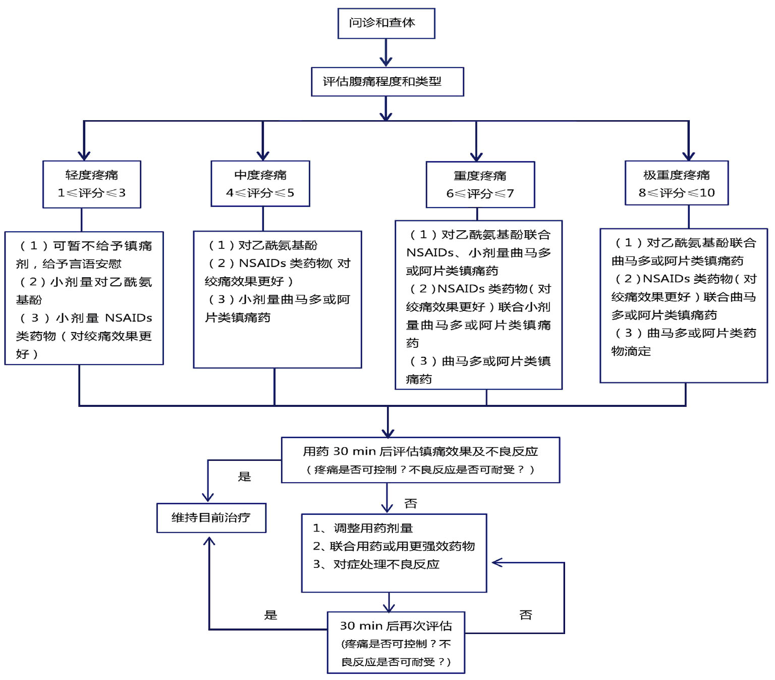 2 NTAA患者的疼痛评估具有毒麻药品处方资质的医生在完成问诊、体格检查的同时,需要对疼痛性质及程度进行评估,应根据疼痛性质及程度给予相应镇痛剂,应用镇痛剂30 min后对镇痛效果进行复评并评估不良反应,根据复评结果指导进一步镇痛措施。
