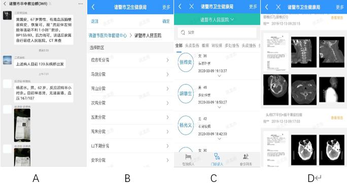 | A:微信群传递患者信息;B:医共体分院信息;C:获取患者具体信息;D:获取患者医共体检查信息 图 2 患者信息获取与共享 Fig 2 Delivers, get, and obtain the patients information |