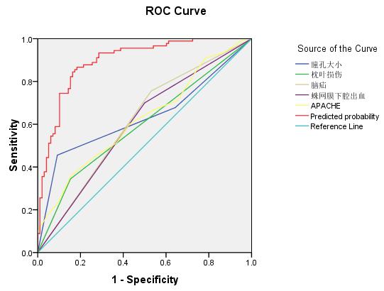 CT扫描对颅脑损伤的诊断和预后中的价值很大,可以明确是哪种类型和部位的脑损伤(蛛网膜下腔或其他类型,枕叶损伤或其他部位),通过分析否有脑疝、弥漫性轴索损伤等形成,从而判断预后情况。本研究中,几个单独的CT特征,如枕叶损伤、SAH的出现、脑疝形成与严重颅脑损伤后的不良结果相关。事实上,尽管CT特征对识别严重颅脑损伤患者和最终的神经外科干预有价值,但CT特征并不是完美的预测因素[15]。本研究多因素Logistic回归模型发现,单运用CT特征预测死亡概率不高,各个危险因素预测死亡的ROC分别为:0.636(瞳孔情况)、0.595(枕叶损伤)、0.599(蛛网膜下腔出血)、0.611(脑疝)和0.621(APACHEⅡ),联合各个危险因素优化的死亡预测概率模型ROC为0.860,明显提高了敏感性和特异性。