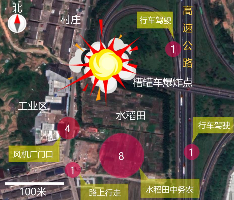 2 结果 2.1 患者基本情况患者年龄为(65.9±16.3)岁,烧伤面积为(85.1±14.3)%,简易烧伤指数(ABSI)为14.7±1.8,修正Baux评分(168.0±22.4)分。入院后评估SOFA评分为(10.7±2.4)分,APACHE Ⅱ评分为(26.4±4.5)分。经过治疗,30 d内无人死亡,60 d内死亡人数为5人。患者的90 d存活率为60.0%(见表 1)。爆炸事件发生时,各个患者所在位置如图 2,其中有8例患者在稻田务农,2例在高速公路上驾驶,4例在工业区机厂门口,1例在路上行走。见图 2。