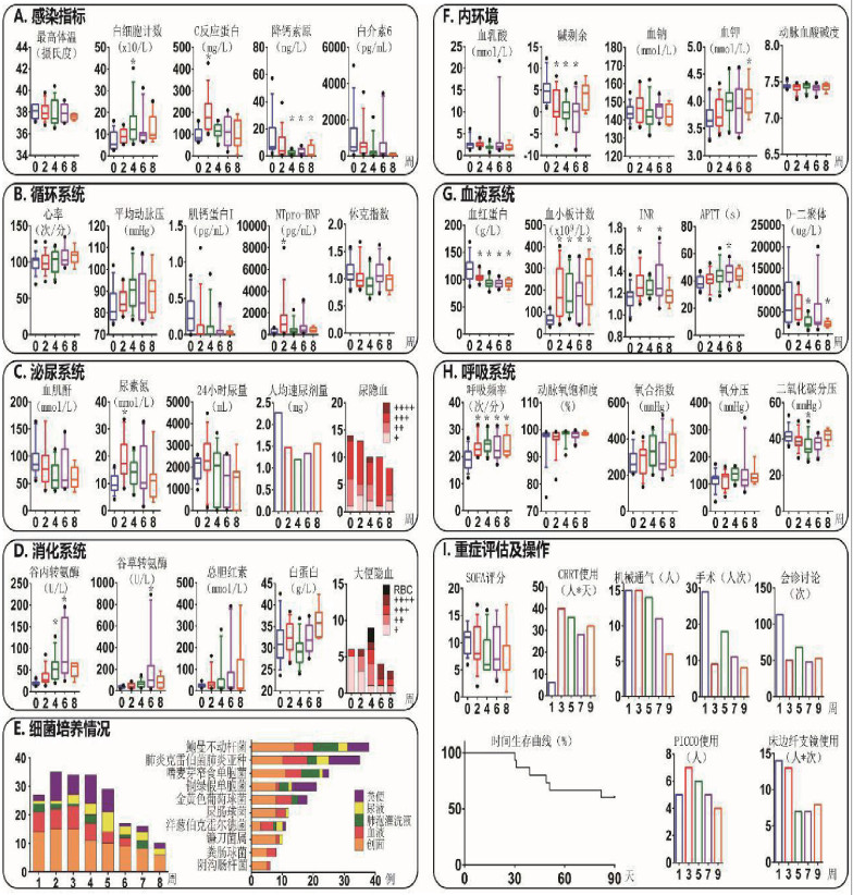 1.3 观察指标对患者入院时、入院后2周、4周、6周、8周时各个系统的检测指标进行回顾性分析,包括炎症指标、循环系统、泌尿系统、消化系统、内环境、血液系统、呼吸系统及序贯器官衰竭评分(SOFA)等。另外,本研究统计了患者入院后的第1、3、5、7、9周内进行的相关操作,包括CRRT、纤支镜检查、手术次数、PICCO的使用以及会诊讨论的次数。对患者入院后培养检出的细菌种类和检出部位的进行分析。