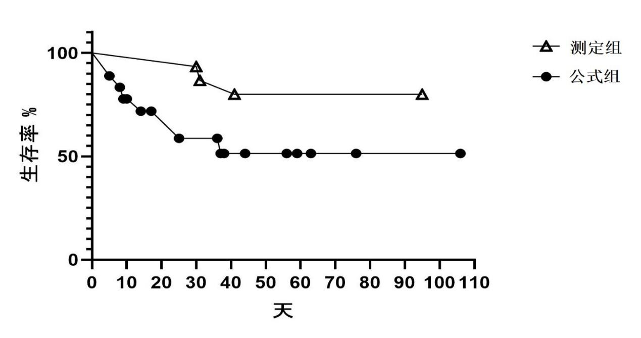 以院内死亡为终点事件,测定组生存率为80.0%(12/15),公式组为55.6%(10/18)。使用Breslow检验,两组生存曲线差异有统计学意义(P=0.033)。见图 3。