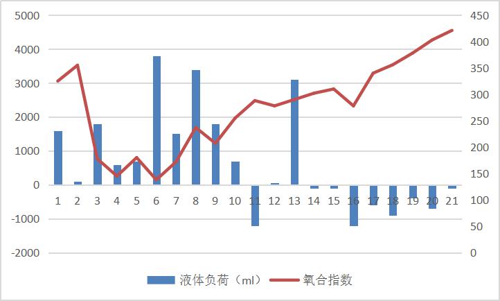 | 图 2 患者入院3周内每日液体负荷和氧合指数变化 |