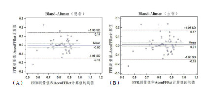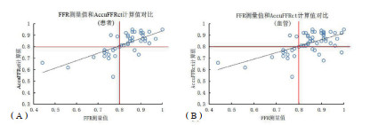 | 图 1 FFR-CT值与FFR测量值的关系:(A)针对不同的患者;(B)针对不同的血管。 Fig 1 The relationship between FFR-CT and FFR measurement: (A) for different patients; (B) for different blood vessels. |