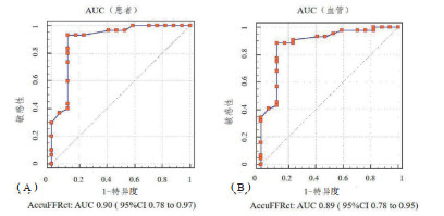 | 图 3 FFR-CT计算值的AUC结果分析,分别对(A)患者或者(B)血管进行分析 Fig 3 Analysis of AUC results of FFR-CT for (A) patients or (B) blood vessels |