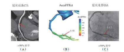 目前,血流储备分数(FFR)作为冠状动脉狭窄是否需要干预的功能学金标准被医生所接受,但FFR存在有创、费用高等缺点。冠状动脉CTA已经基本普及,使用冠状动脉CTA可以快速筛选严重狭窄的冠状动脉患者[1]。但冠状动脉CTA有较高的阴性预测值,对于阳性病变仅狭窄程度无法准确估算[2]。如何使用冠状动脉CTA通过流体力学基本算法快速、准确得到仿真的FFR值成为研究热点。美国HeartFlow公司的ADVANCE注册研究[3-4]发现与FFR-CT值异常的患者相比,FFR-CT为阴性的患者的血运重建较少,且有降低主要不良心血管疾病事件(MACE)和显著降低心血管疾病死亡或心肌梗死的趋势。FFR-CT与有创FFR具有较高的相关性和准确性,特别是从无创的角度或者是减少医疗费用来看,更具有优越性。