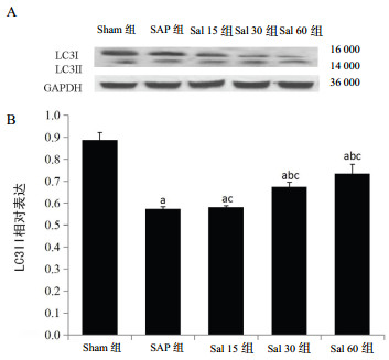 | A:LC3蛋白印迹图;B:LC3 Ⅱ的相对表达;与Sham组比较,aP<0.05;与SAP组比较,bP<0.05;Sal各组间两两比较,cP<0.05 图 1 各组大鼠胰腺组织LC3蛋白的表达水平 Fig 1 The expression of pancreatic tissue protein LC3 in each group of rats |