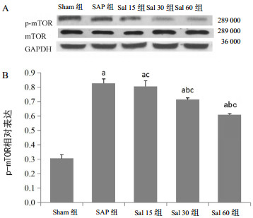 mTOR蛋白表达的Western blot检测结果见图 2A,p-mTOR相对表达如图 2B所示。与Sham组相比,SAP组和Sal各组p-mTOR蛋白相对表达水平明显上调,差异有统计学意义(P<0.05);经红景天苷干预,Sal 30、Sal 60组的p-mTOR相对表达水平较SAP组显著下调,差异有统计学意义(P<0.05),且以Sal 60组下调最明显,而Sal 15组差异无统计学意义(P>0.05);p-mTOR表达水平变化在Sal各组间差异有统计学意义(P<0.05)。