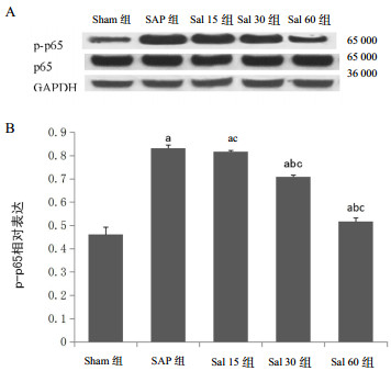| A:P65蛋白印迹图;B:p-p65的相对表达;与Sham组比较,aP<0.05;与SAP组比较,bP<0.05;Sal各组间两两比较,cP<0.05 图 3 各组大鼠胰腺组织蛋白p65蛋白表达水平 Fig 3 The expression of p65 protein in pancreas in each group of rats |